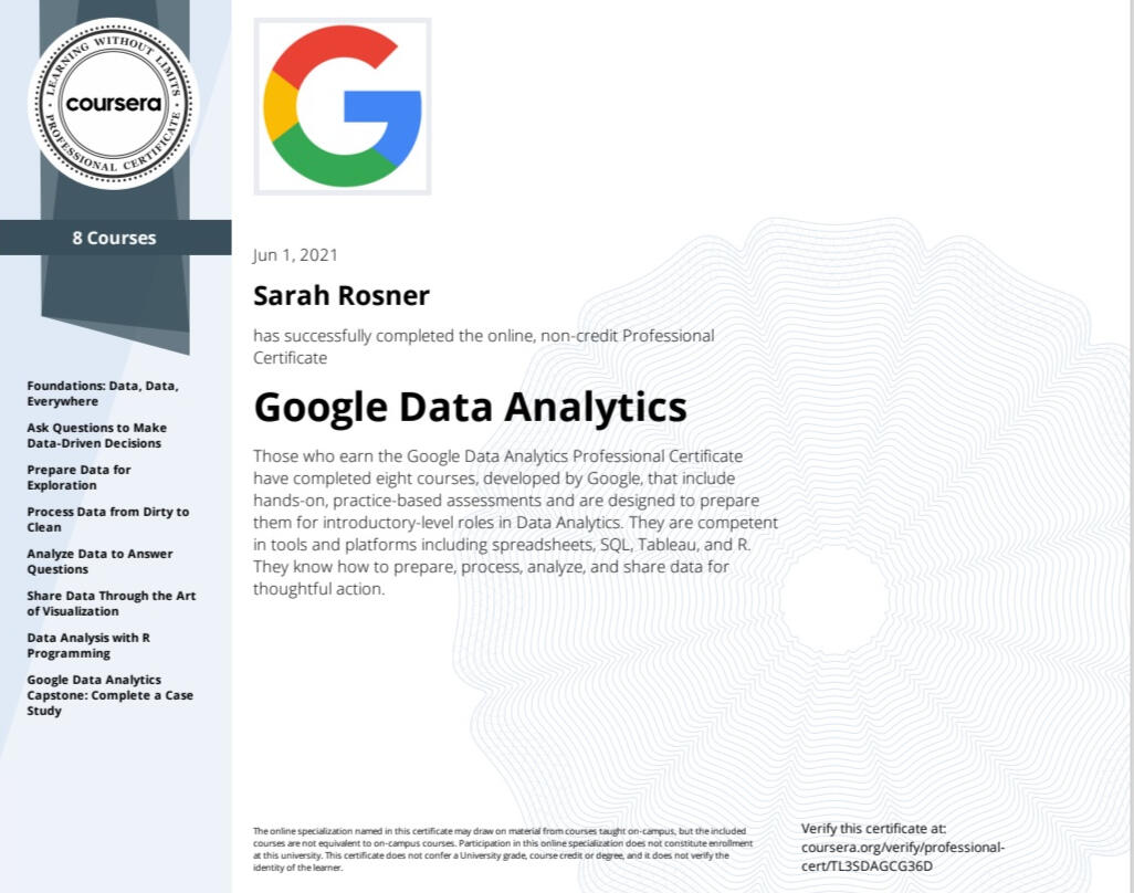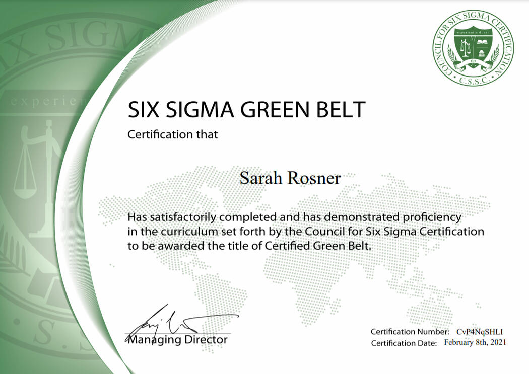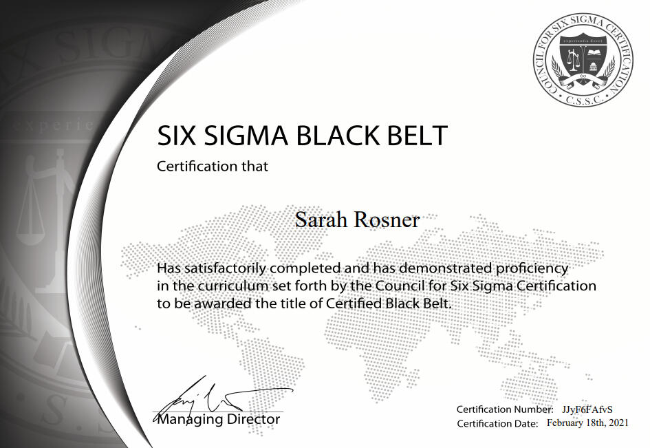 Hello! I'm Sarah Rosner, an accomplished professional with a diverse background in business strategy, process improvement, and data analytics. As a Six Sigma Black Belt certified professional with an MBA in Strategic Management, I excel in driving operational efficiency and delivering impactful results. My unique blend of humanities and analytics background allows me to approach challenges with a holistic perspective, leveraging data-driven insights to optimize processes and enhance organizational performance.Below you will find my resume, recent accomplishments, core values, and some more pertinent information, so that you can get a more complete picture of me.I am always eager to expand my knowledge and skills, which is why I continue to pursue additional coursework. Recently this has been in law, humanities, data analytics, and Salesforce.Feel free to connect with me and explore potential opportunities for collaboration or process improvement initiatives.